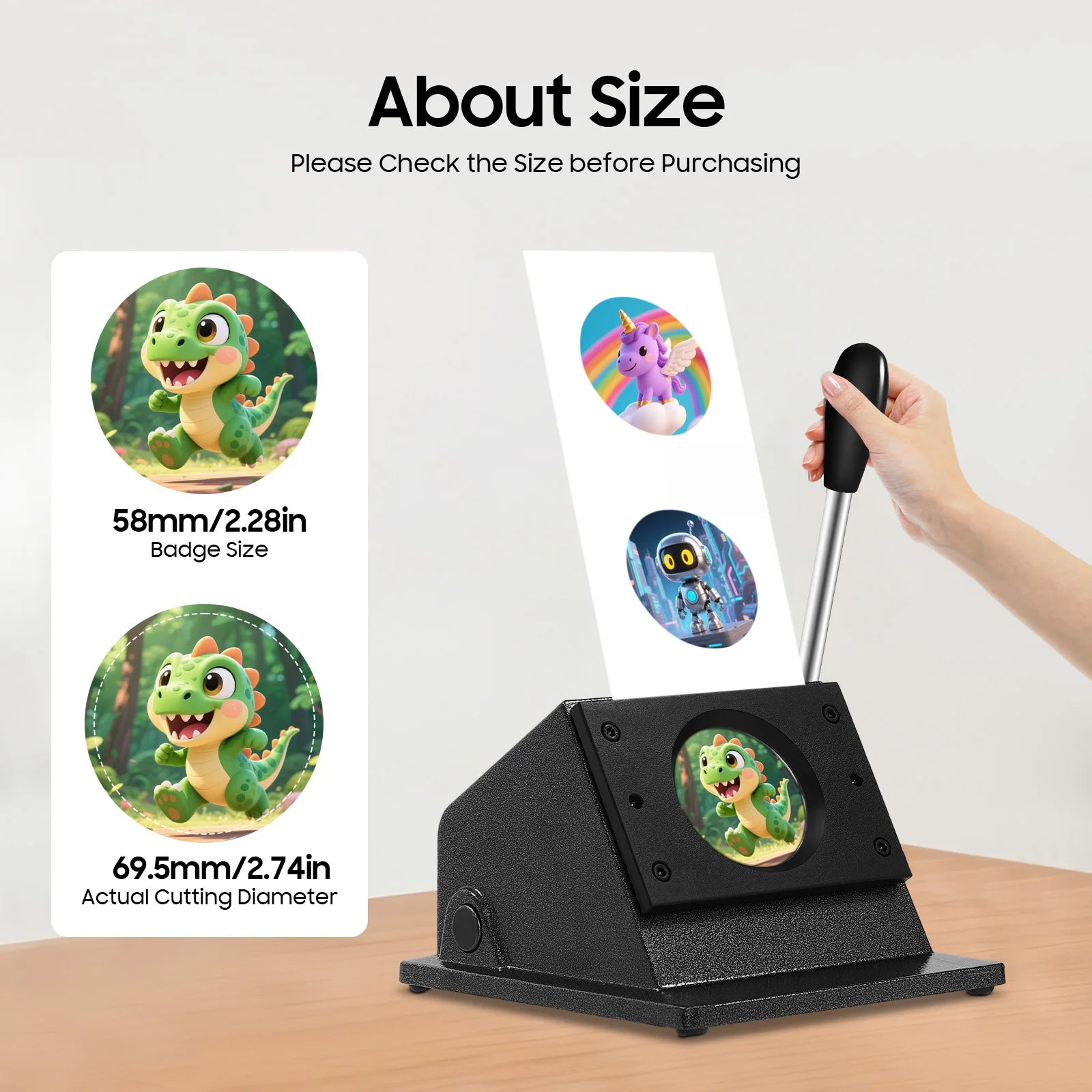 - Precise, burr-free cuts every time thanks to sharp, quenched blades and a 69.5 mm cutting hole that yields 58 mm badge circles.