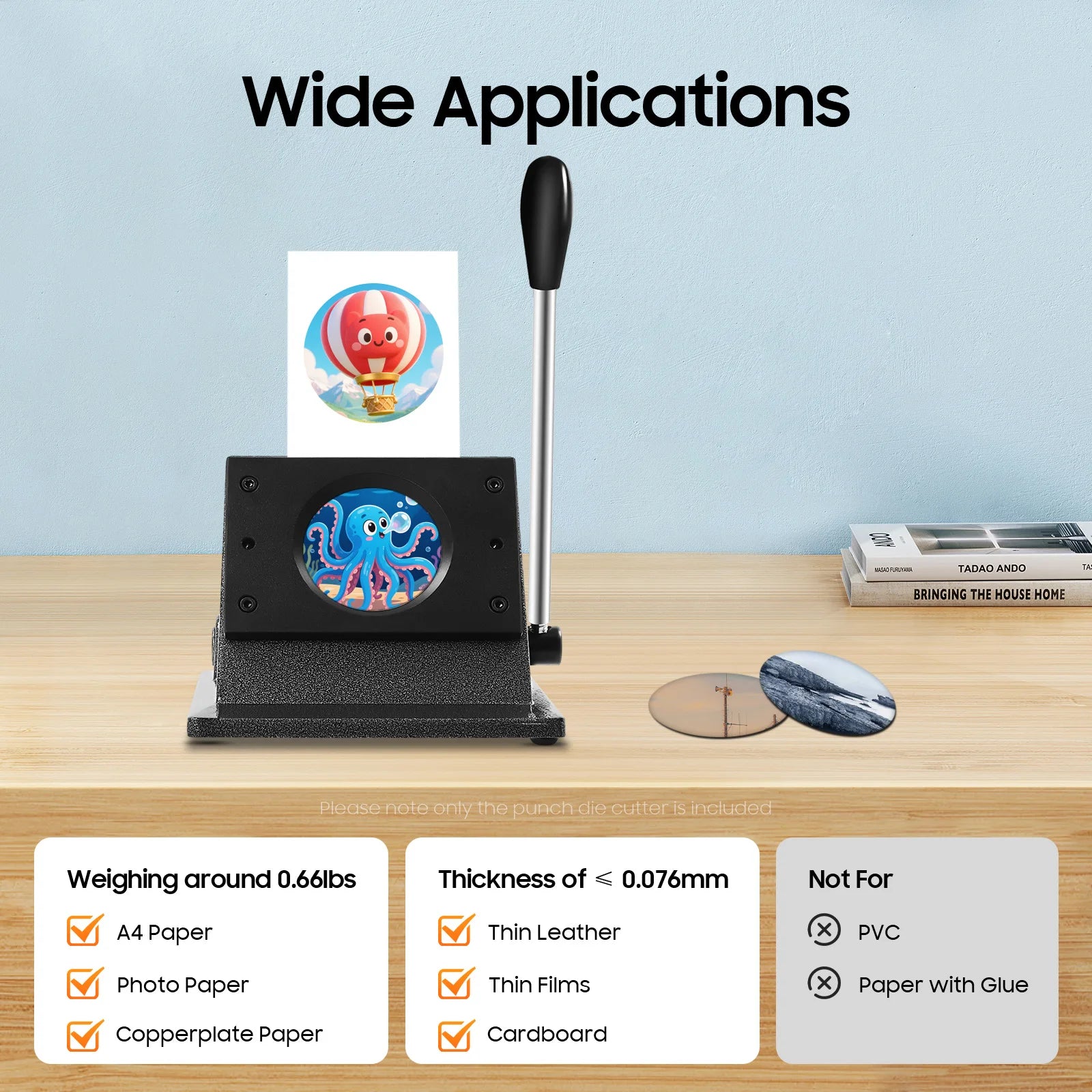 - Versatile for DIY projects: perfect for buttons, small mirrors, bottle openers, and other round items; supports paper (A4, photo, copperplate), thin films, cardboard, and leather up to 0.076 mm.