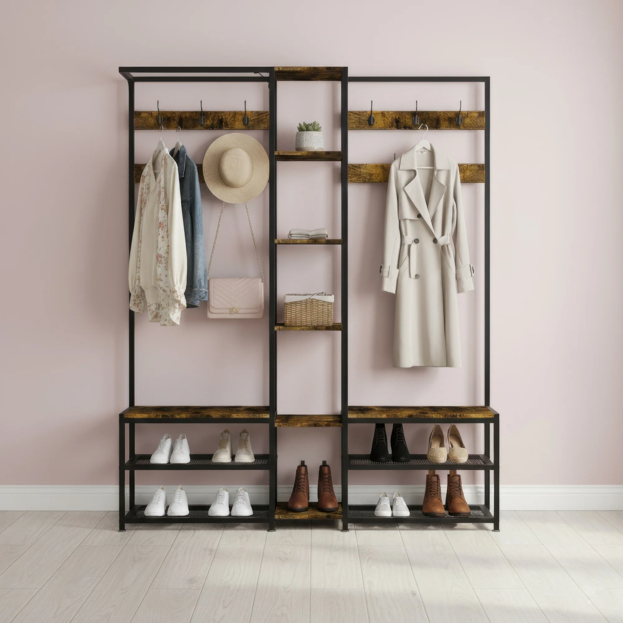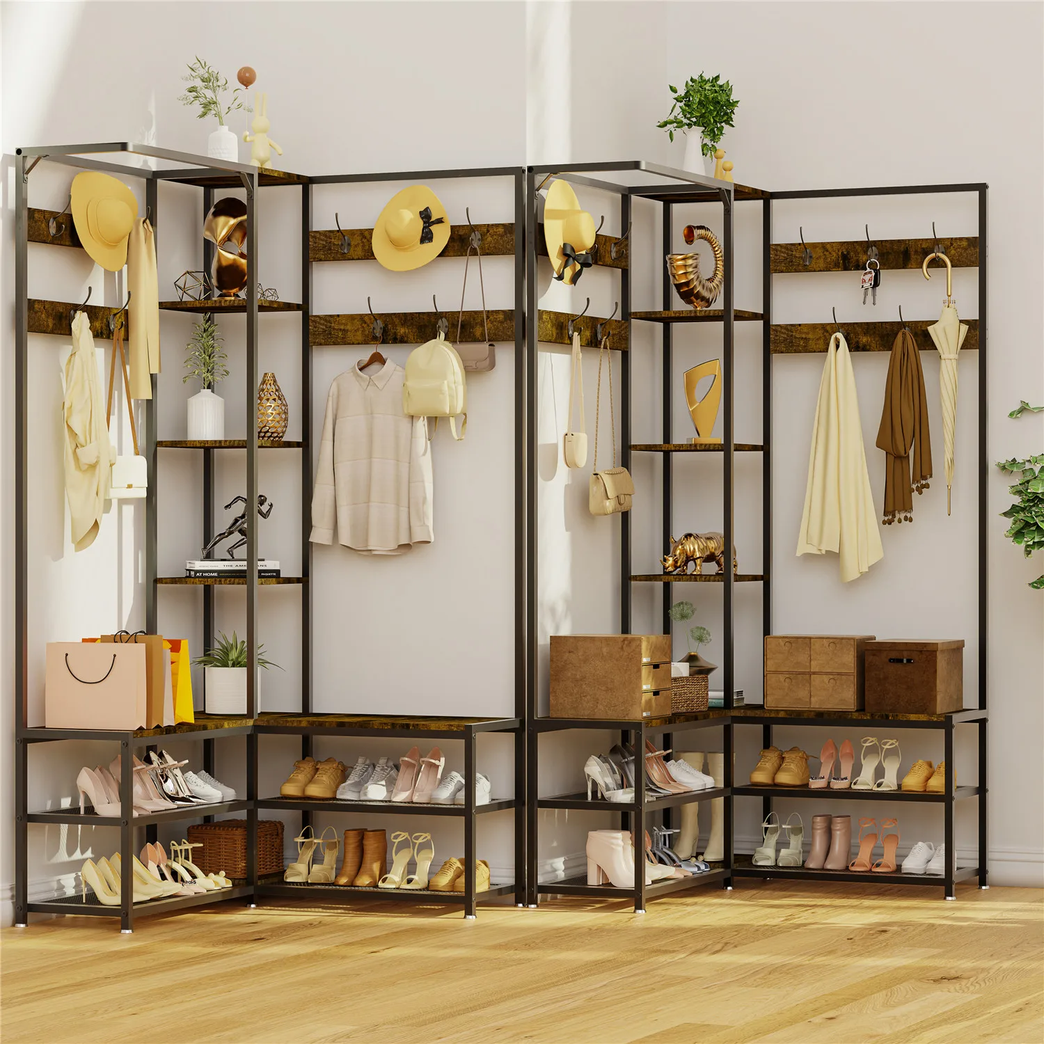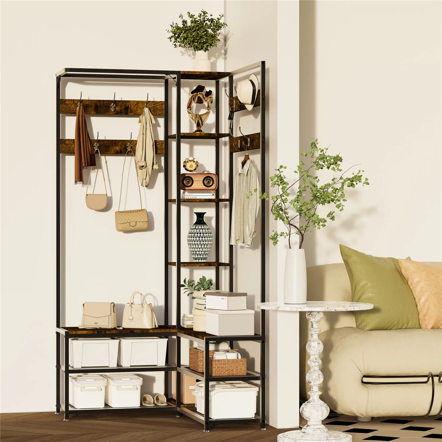 - Help yourself optimize corner space with a sturdy L-shaped hall tree that blends a 10-hook garment rack with a spacious shoe bench, keeping coats, bags, and footwear in one place.