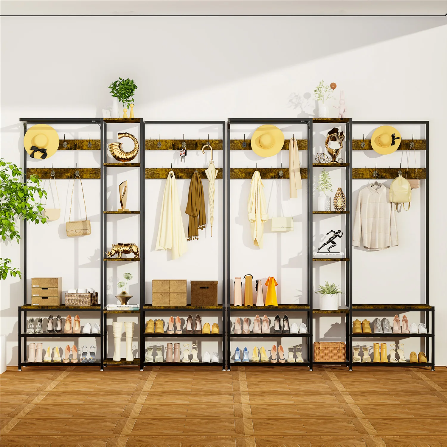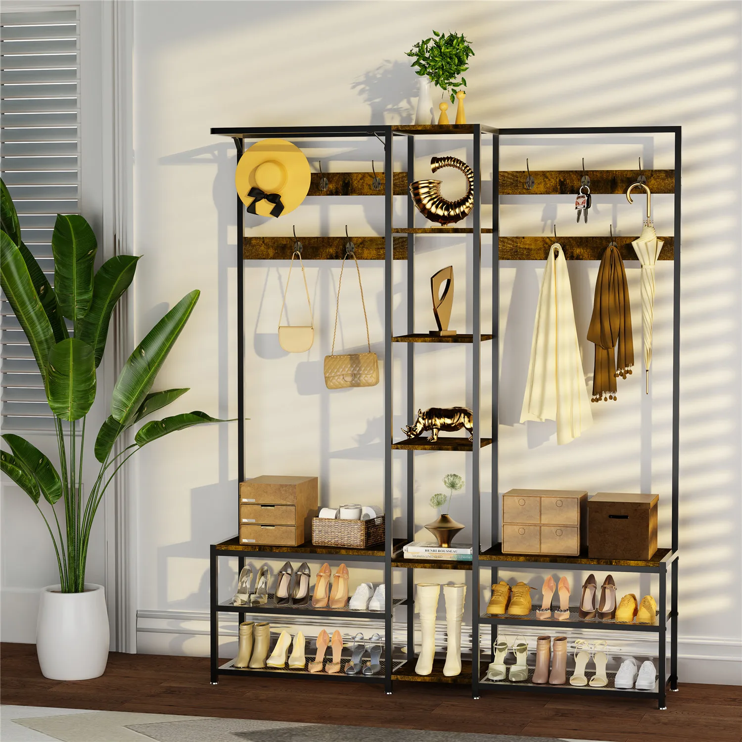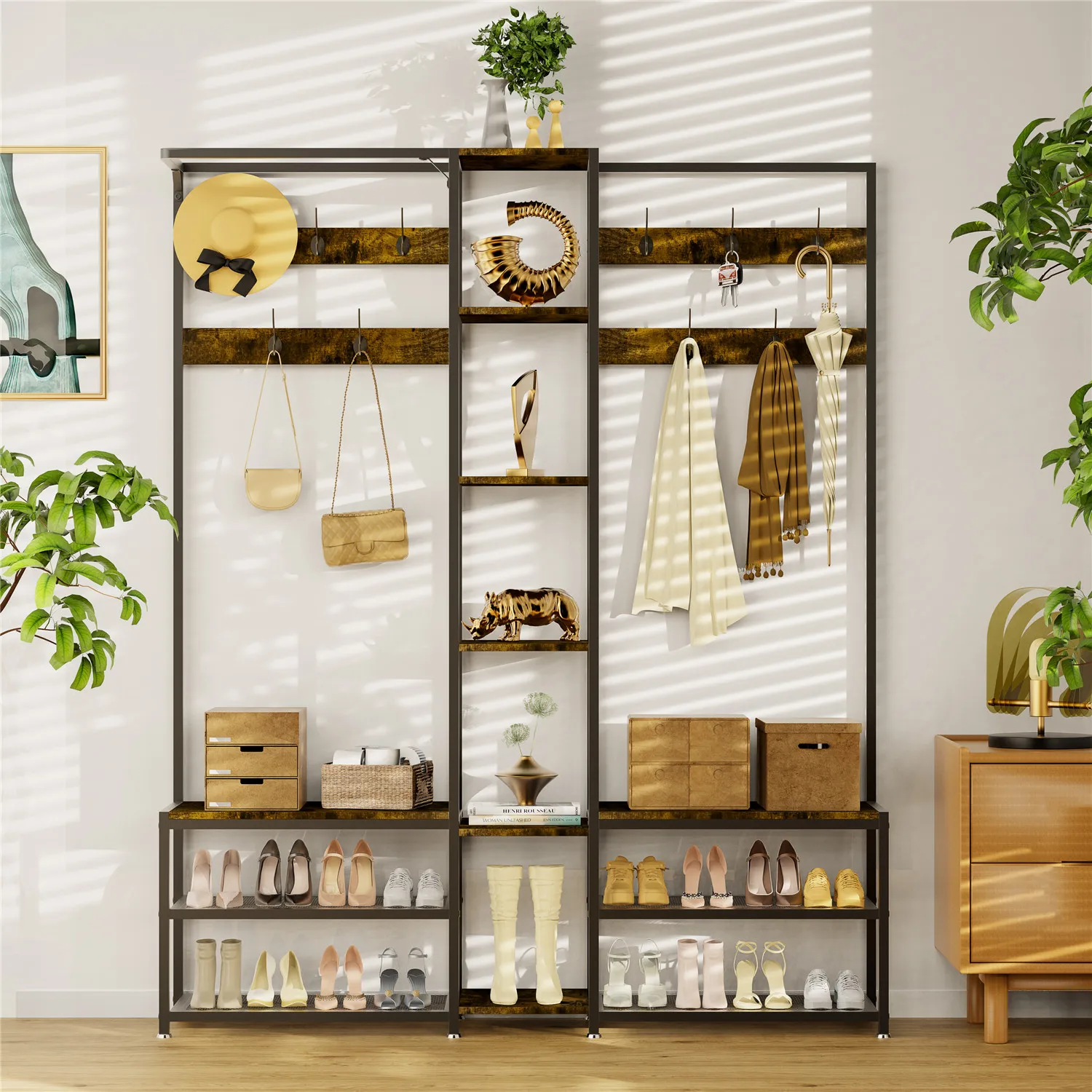 - Help yourself optimize corner space with a sturdy L-shaped hall tree that blends a 10-hook garment rack with a spacious shoe bench, keeping coats, bags, and footwear in one place.